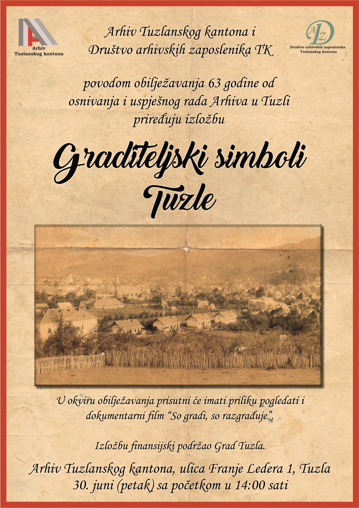 Arhiv TK i Društvo arhivskih zaposlenika TK povodom obilježavanja 63 godine od osnivanja i uspješnog rada Arhiva u Tuzli priređuju izložbu “Graditeljski simboli Tuzle”.