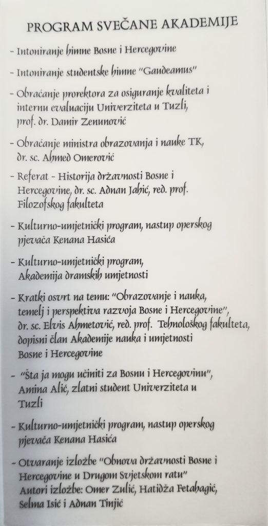 Ministarstvo obrazovanja i nauke TK, Univerzitet u Tuzli, Pedagoški zavod TK, JU Arhiv TK i Muzej Istočne Bosne povodom Dana državnosti Bosne i Hercegovine organiziraju Svečanu akademiju obrazovnih institucija Tuzlanskog kantona.